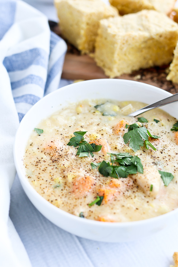 If you consider corn chowder to be a “been there done that” kind of meal — think again! Tender chicken, crisp corn, and the surprise addition of sweet potatoes turn this into a chowder that you’ll be dreaming about all week! This all-in-one meal will leave you gleefully full and satisfied!