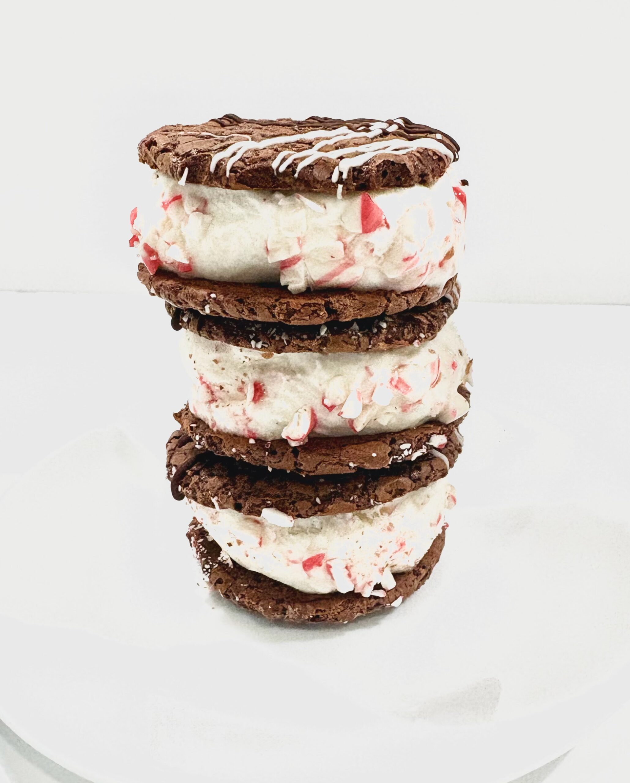 A soft peppermint-brownie cookie filled with vanilla ice cream, rolled in crushed peppermint candy, then double drizzled with silky dark AND white chocolate ganache. There couldn’t be a more perfect holiday treat!